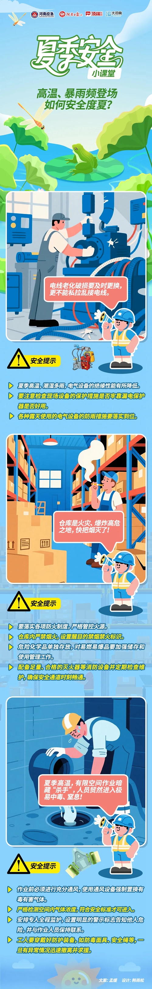 夏季天氣炎熱,同時暴雨、雷電等天氣逐漸增多,生產(chǎn)現(xiàn)場高溫、潮濕,容易導(dǎo)致各類事故發(fā)生。這樣的天氣條件下暗含哪些安全生產(chǎn)隱患?炎炎夏日,生產(chǎn)過程中需要重點防范些什么?一起來學(xué)習(xí)——