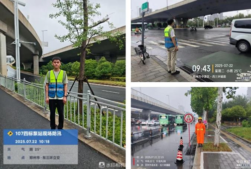 鄭州城建集團子公司城投建工道路運維項目及時部署防汛工作,投入大量人員、車輛及阻水板、反光錐等物資,明確防汛重點,在積水點,第一時間確保人員在崗值守。