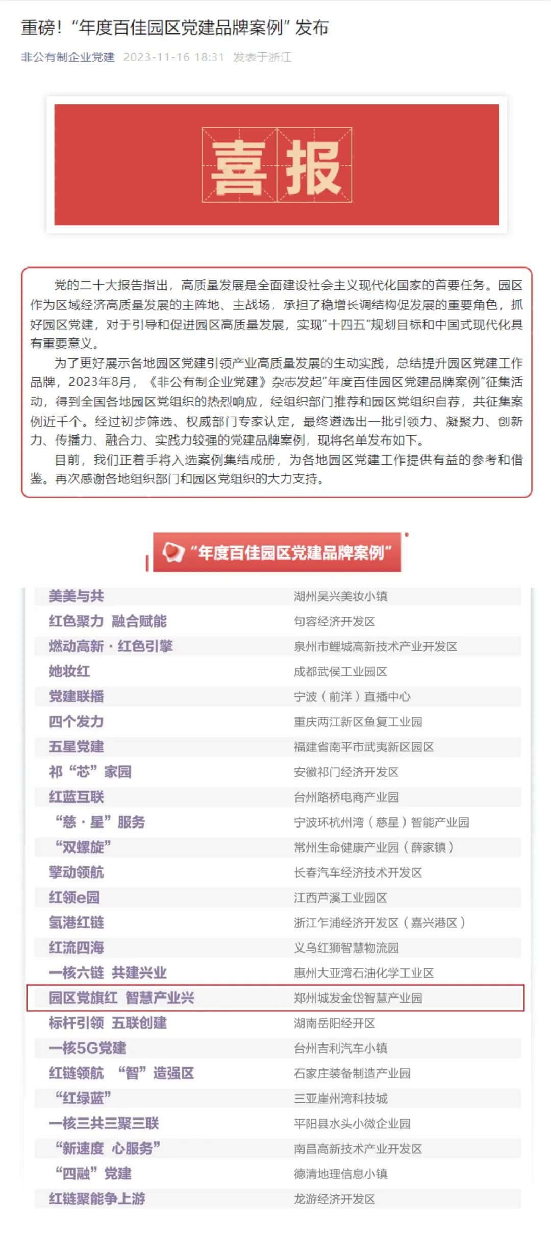 11月16日,由《非公有制企業(yè)黨建》雜志發(fā)起的“年度百佳園區(qū)黨建品牌案例”征集活動遴選結果揭曉。鄭州城發(fā)集團“園區(qū)黨旗紅 智慧產(chǎn)業(yè)興”基層黨建“書記項目”從近千個入圍案例中脫穎而出,成功入選“年度百佳園區(qū)黨建品牌案例”。