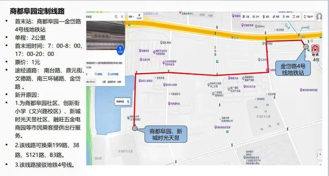 專線開通后,商都阜園項目租戶及業(yè)主實現了“出門即坐上公交,下車即地鐵口”的通勤效率新格局。線路途徑南臺路、鼎元街文德路、南三環(huán)輔路;中途包含超市、理發(fā)店、小商品城等便民商業(yè)點。無論是上班還是購物,都能享受到高效、舒適的出行體驗。線路單程2公里,除直達地鐵口外也可換乘199路、38路、S121路、B3路。不僅解決了租戶的通勤難題,也為周邊社區(qū)居民提供了便利,得到了大家的一致好評。