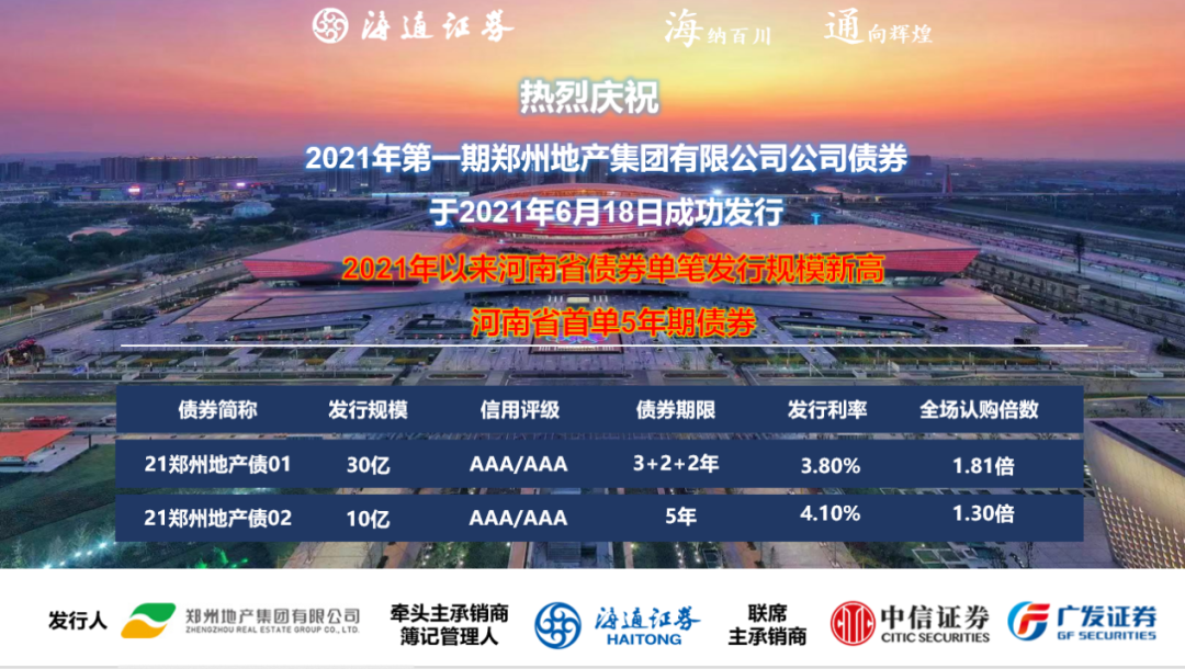 黨史學(xué)習(xí)教育在鄭州地產(chǎn)集團(tuán)如火如荼開展,集團(tuán)黨委在鄭州市委、市政府的領(lǐng)導(dǎo)下,在鄭州市國資委黨委的監(jiān)管下,在學(xué)黨史、悟初心的基礎(chǔ)上,將“辦實(shí)事、解難題”作為黨史學(xué)習(xí)教育的重要內(nèi)容,充分釋放黨建紅色生產(chǎn)力,推進(jìn)黨史教育深入業(yè)務(wù)實(shí)踐,引領(lǐng)業(yè)務(wù)高質(zhì)量發(fā)展。在集團(tuán)黨委的堅(jiān)強(qiáng)領(lǐng)導(dǎo)下,鄭州地產(chǎn)集團(tuán)6月18日成功發(fā)行第一期優(yōu)質(zhì)企業(yè)債券40億元,3+2+2年期產(chǎn)品發(fā)行利率3.8%,5年期產(chǎn)品發(fā)行利率4.1%。本次發(fā)行創(chuàng)河南省首單5年期企業(yè)債券,創(chuàng)2021年以來河南省債券單筆發(fā)行規(guī)模新高,是鄭州地產(chǎn)集團(tuán)資本市場(chǎng)融資工具的又一創(chuàng)新探索!